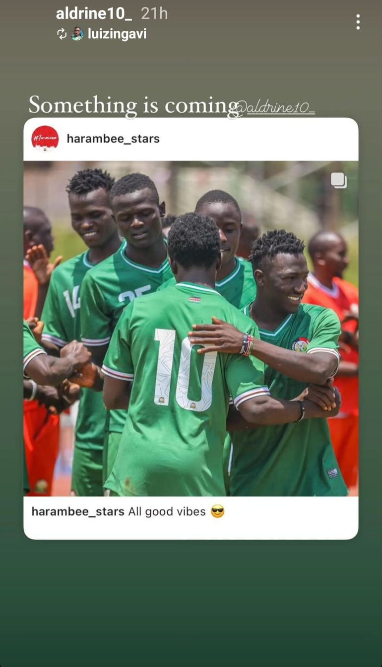 Ingavi shared a post by Harambee Stars of the Junior Stars players with the accompanying message,"Something is coming," which teammate Aldrine Kibet reposted on his story.
