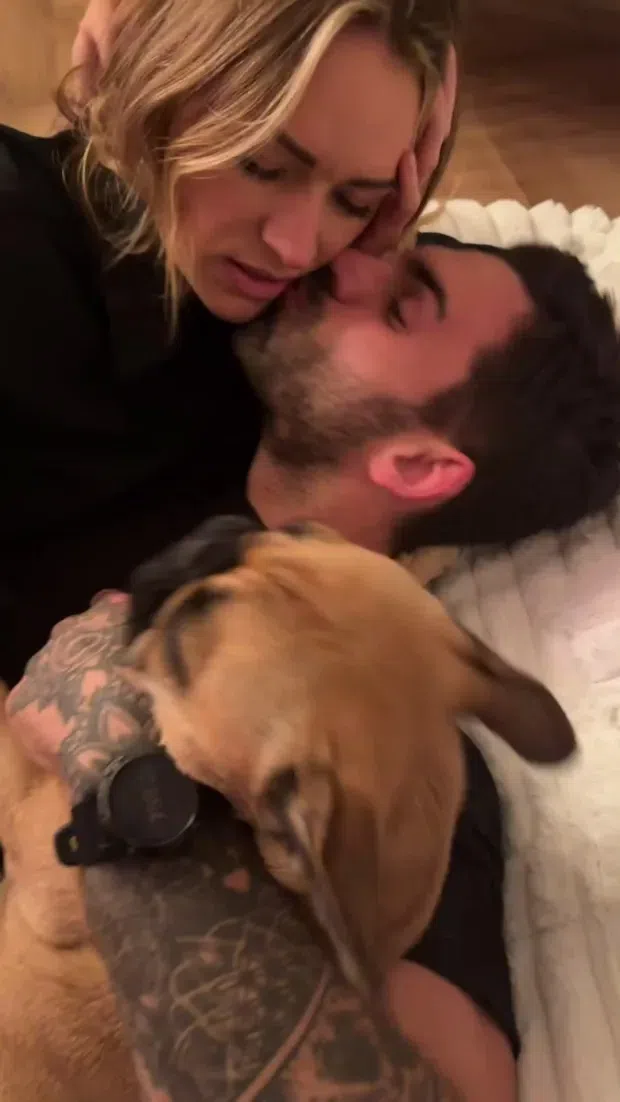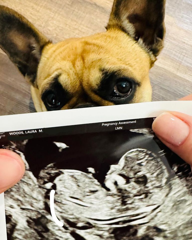Woods shared an ultrasound photo to Instagram, with her French bulldog perched above the surface. The TNT Sports host then added a caption to the image, "Hey, baby."