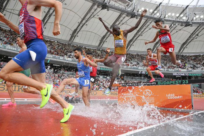 Leonard Chemutai (in yellow) jumps over water obstacle in the 3000m SC heats. Twitter/AfroSportTV