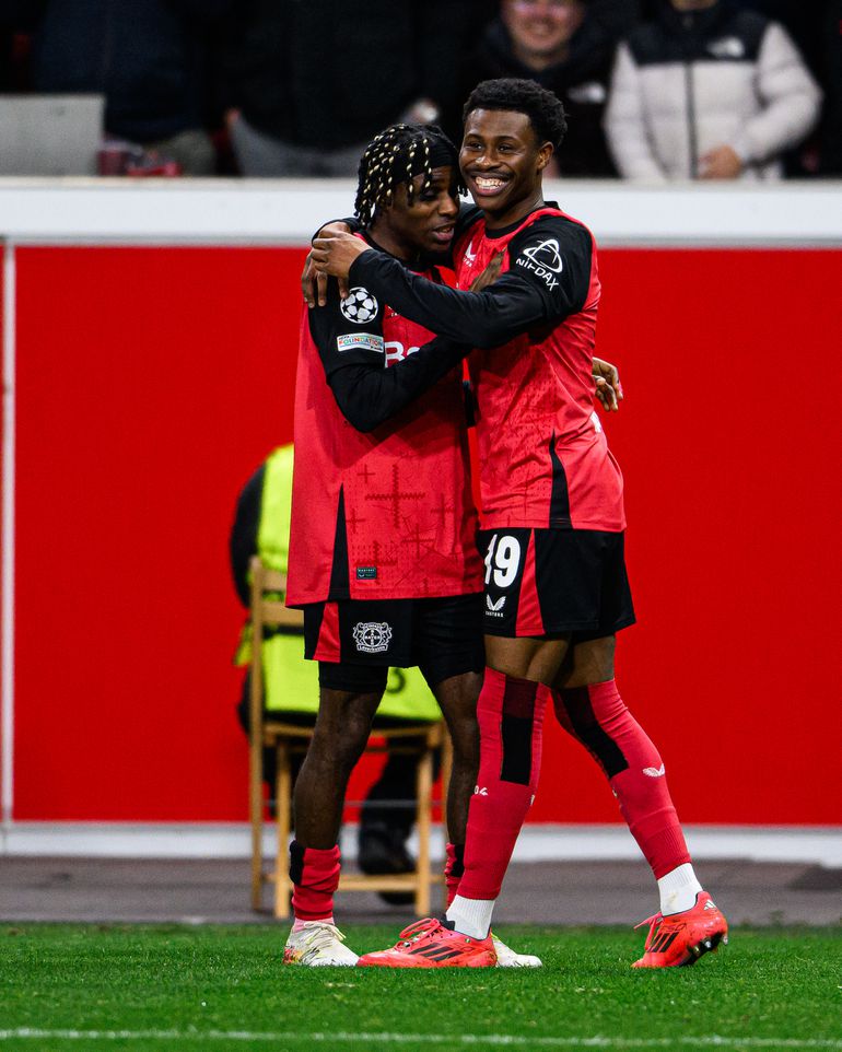 Nathan Tella in the Champions League with Leverkusen teammate Jeremie Frimpong.
