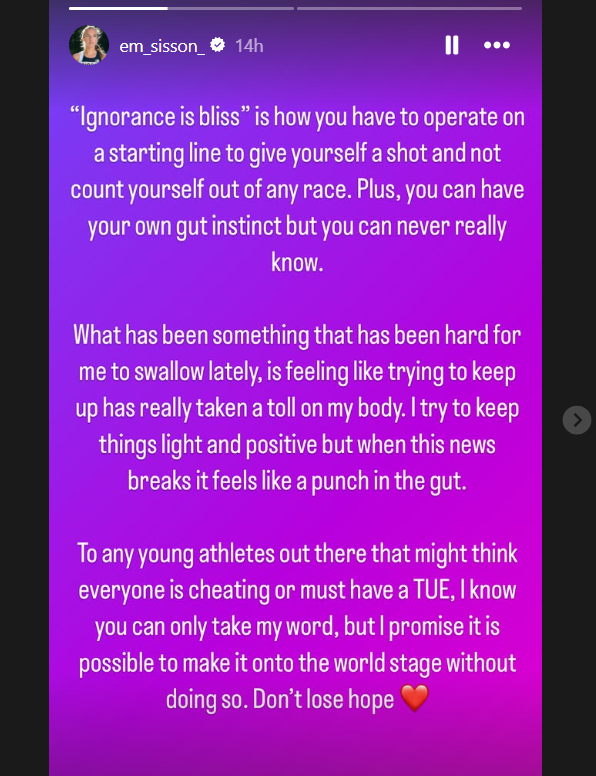 “Ignorance is bliss” is how you have to operate on a starting line to give yourself a shot and not count yourself out of any race. Plus, you have your own gut instinct but you can never really know,” Sisson posted on her Instagram stories.