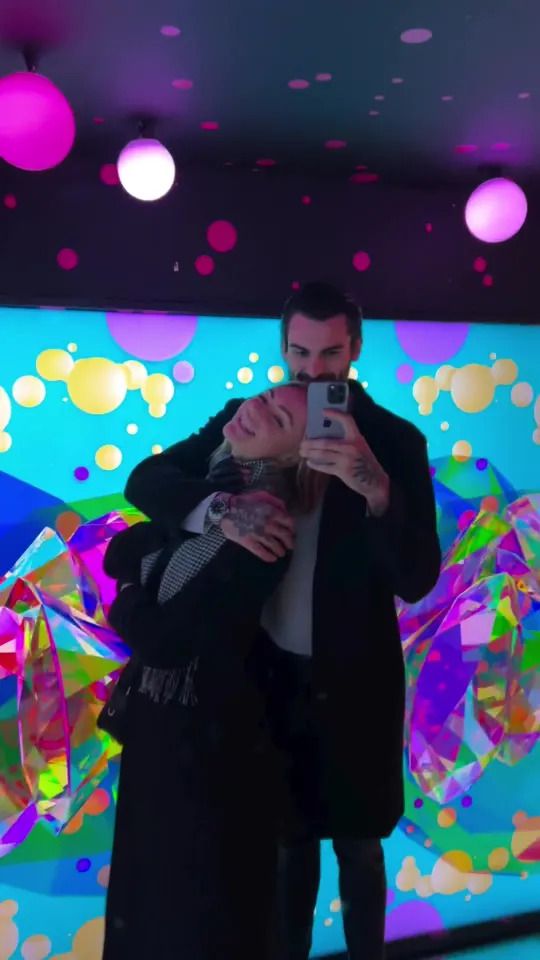 The couple's journey continued into the realms of art, descending into a purple-lit room adorned with colourful hearts, culminating in a tender embrace in front of a vibrant projection.