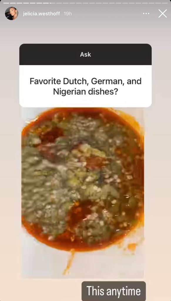 Jelicia shared a snap of herself enjoying the local Nigerian Okra soup and Pounded Yam while captioning it, “This anytime”.