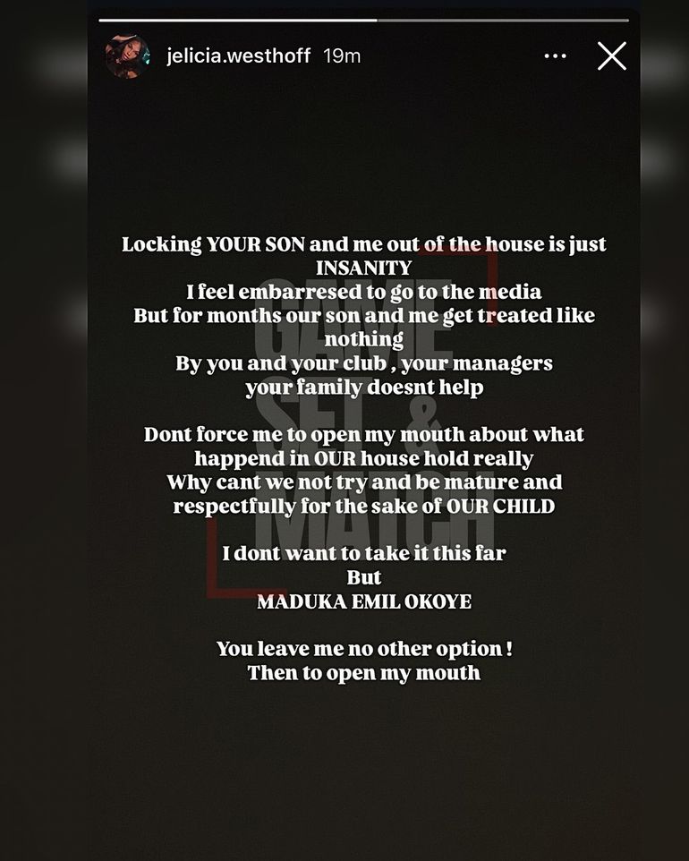 Super Eagles goalkeeper Maduka Okoye, is at the centre of a storm as his partner, Dutch model Jelicia Westhoff, accused him of allegedly locking her and their two-year-old son out of their home.