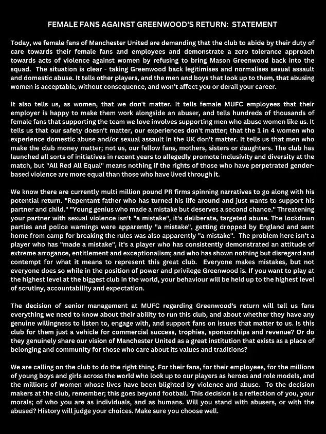 “The decision of senior management at MUFC regarding Greenwood's return will tell us fans everything we need to know about their ability to run this club, and about whether they have any genuine willingness to listen to, engage with, and support fans on issues that matter to us.