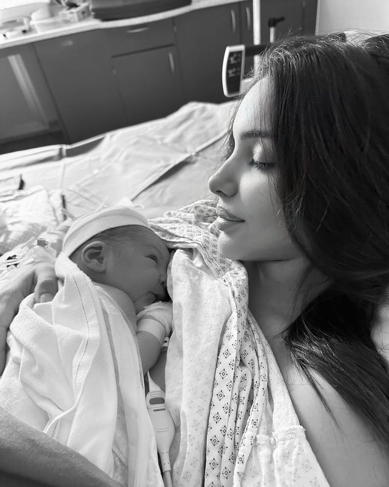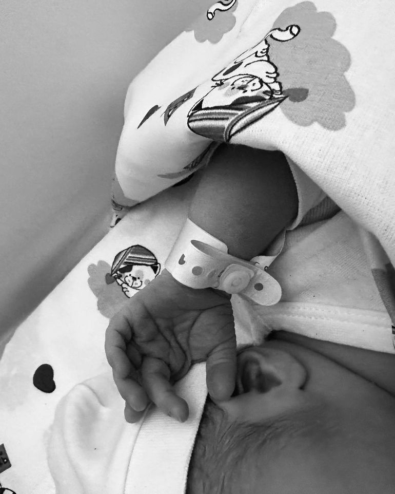 She shared pictures of herself and her husband holding Kais alongside an adorable close up shot of the baby's arm and ear.