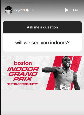 Lyles response - Shared a design of being at the Boston Indoor Grand Prix on February 2nd - His first race of the season.