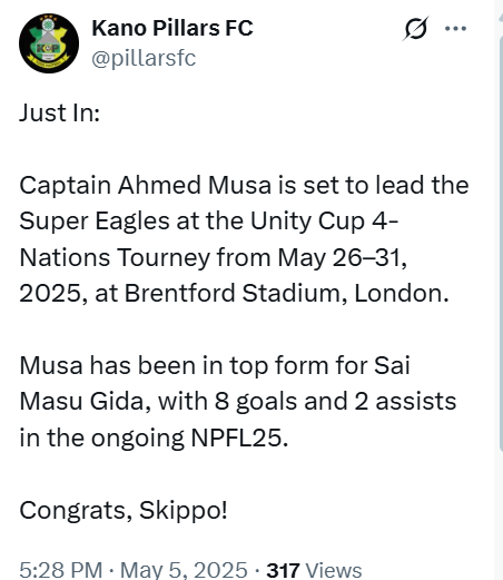 NPFL club Kano Pillars have confirmed that their star forward Ahmed Musa will captain the Nigeria Super Eagles in the upcoming Unity Cup tournament scheduled for late May 2025 at Brentford Stadium, London.