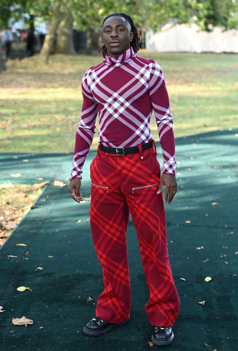 Eze was eye-catching in a check two-piece - a maroon top and bright red trousers.