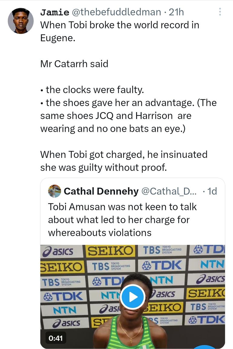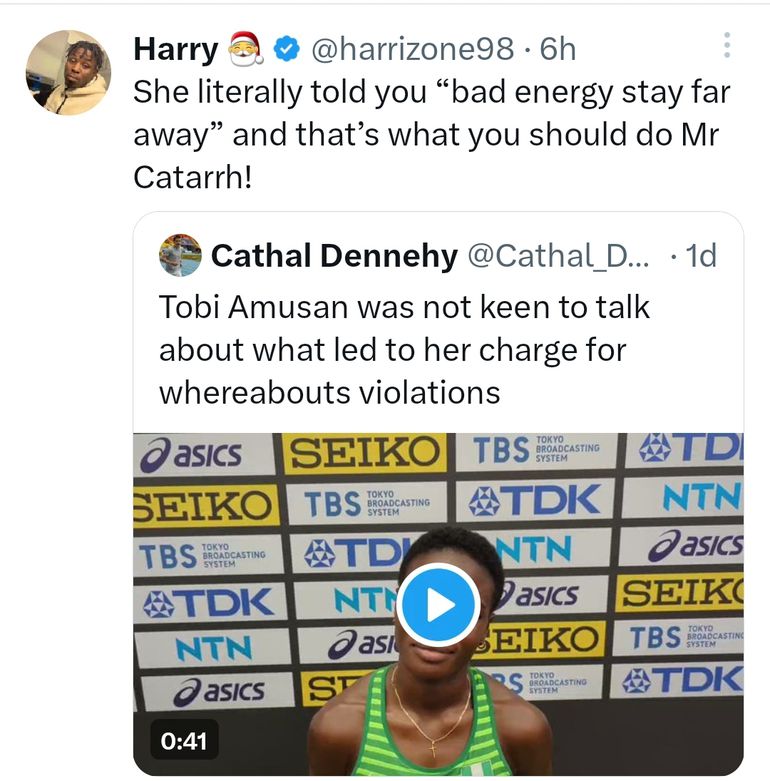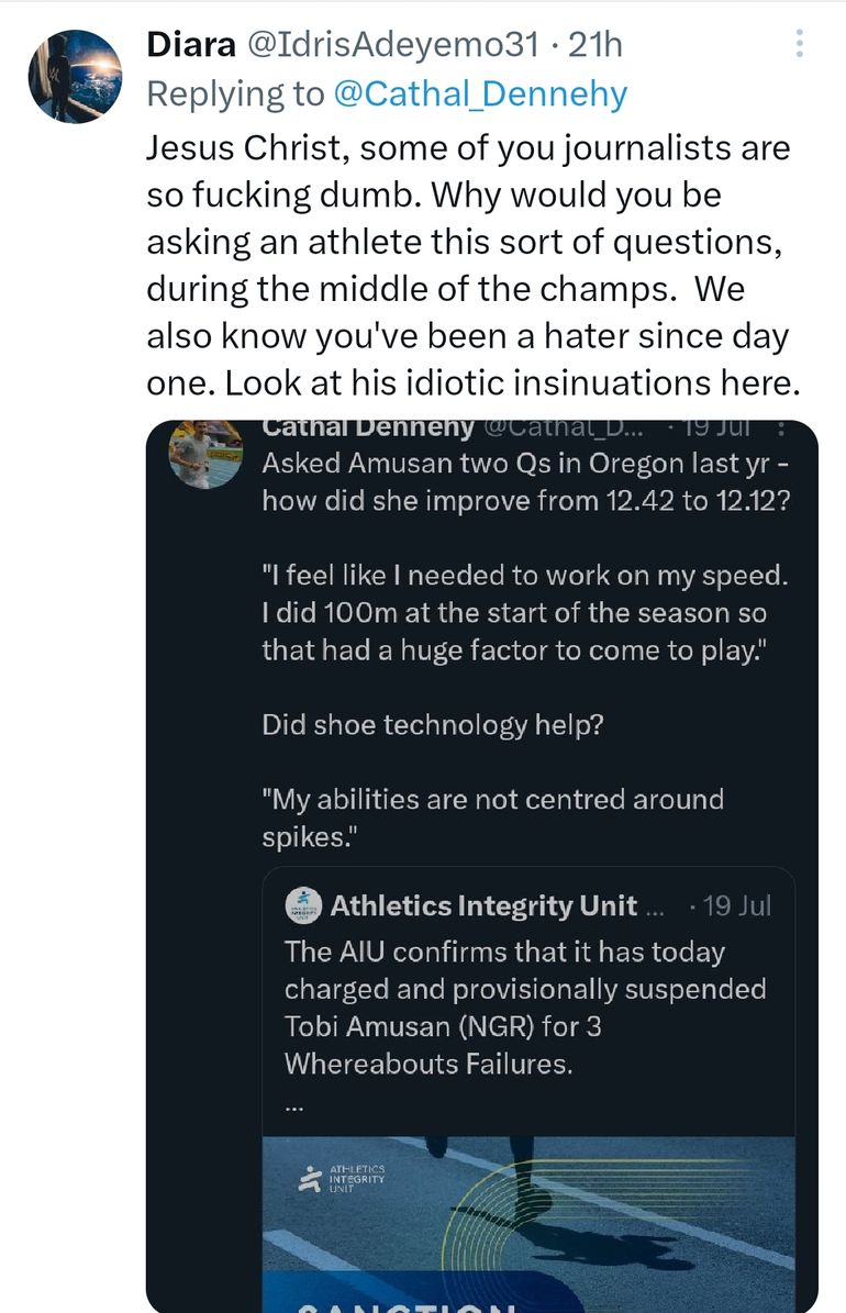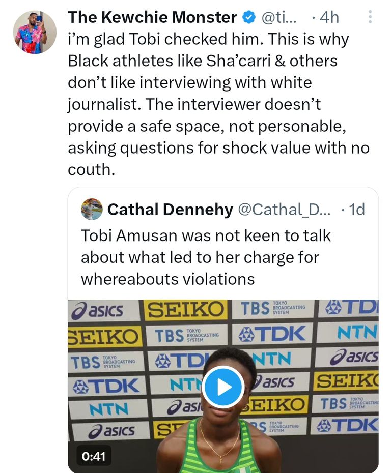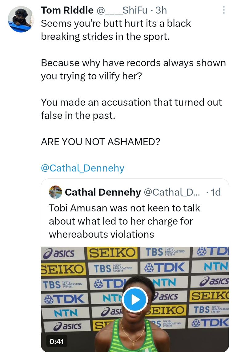 Nigerian athletics fans on Twitter showed no mercy to an Irish journalist who tried to bully Tobi Amusan into answering questions on her Anti Doping Rule Violation (ADRV) clearance.