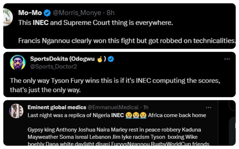A Nigerian on X said, “The only way Tyson Fury wins this is if it's INEC computing the scores, that's just the only way.”