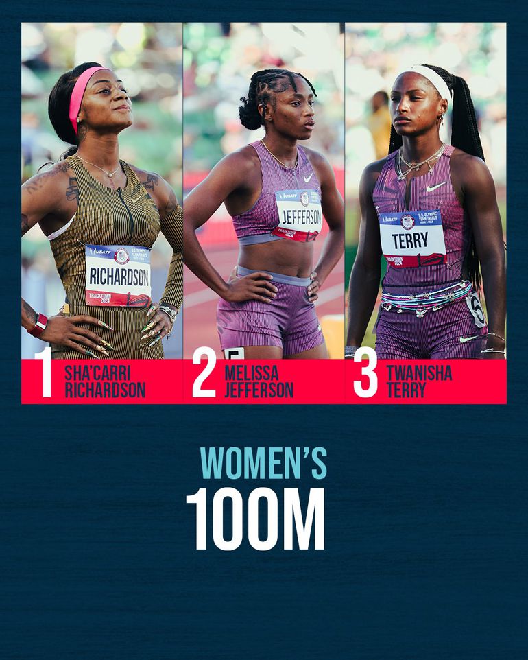 For winning the 100m titles, Lyles and Richardson are USA's undisputed fastest man and woman heading to the Paris Olympic Games, where they'll be gunning to win their country's first Olympic gold medal since 2004 (men's 100m) and 1996 (women's 100m).