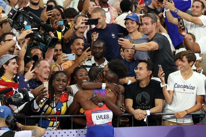 After his win, Lyles ran over to his girlfriend in the stands before giving her an embrace alongside his mother.