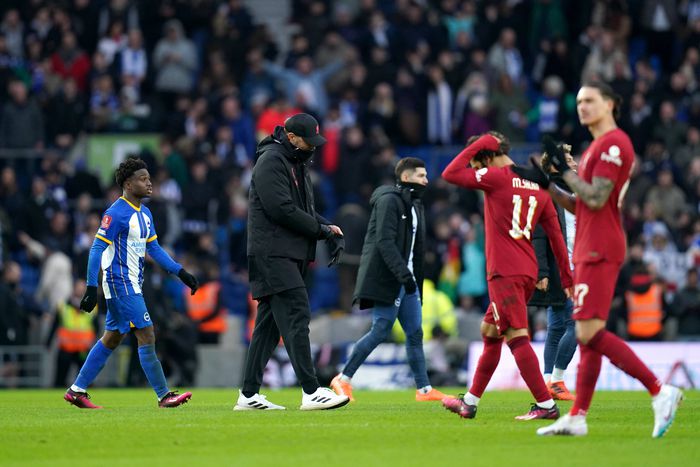 Liverpool crashed out of the oldest cup competition as goals from Lewis Dunk and Kaoru Mitoma cancelled out Harvey Elliot’s opener.
