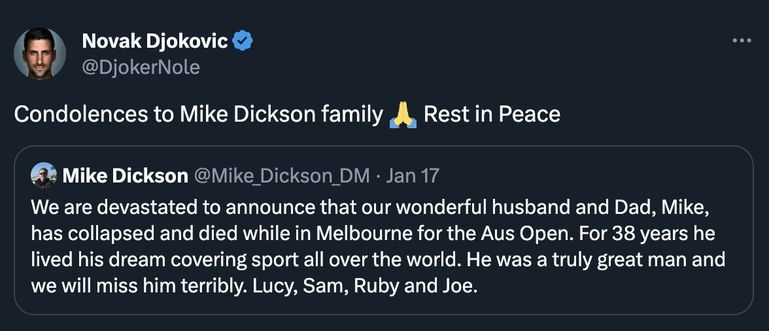 Meanwhile, the Serbian multiple Grand Slam winner has reacted to the news, paying his respect to the Dickson's family.