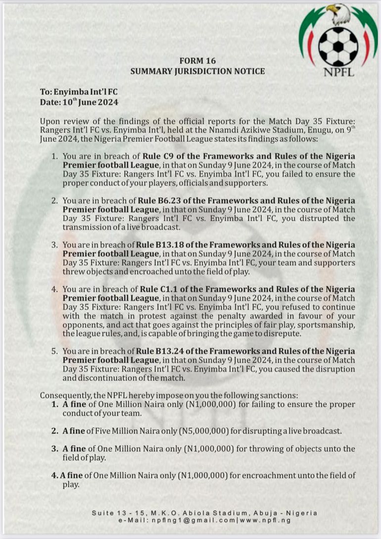 The NPFL verdict. Enyimba forfeit three points and three goals to Rangers.