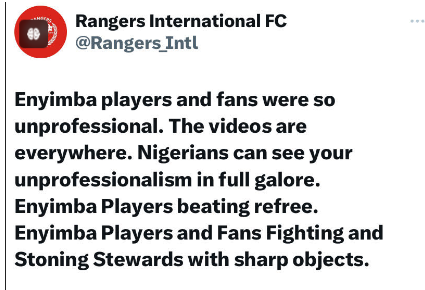 But Rangers hit back explosively with a now-deleted post that read: "Enyimba players and fans were so unprofessional.”