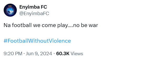 Enyimba fired the first shot across the bows, tweeting: "Na football we come play....no be war" in an apparent dig at the violence and match abandonment.