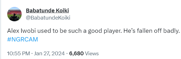 Here are some of the reactions to Iwobi’s outing against the Indomitable Lions at the AFCON 2023.