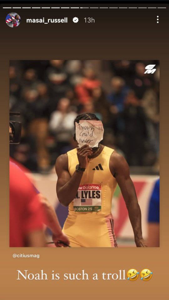 Masai Russell, who also competed at the 2024 Paris Olympics, securing gold in the 100m hurdles while Lyles claimed gold in the 100m, took to social media to chime in on the friendly banter.