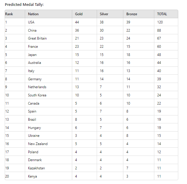 Host nation France is forecasted to secure fourth place overall, with 23 golds and a total of 60 medals, while Great Britain is expected to be the top-performing European nation, with 21 golds and 67 medals in total.
