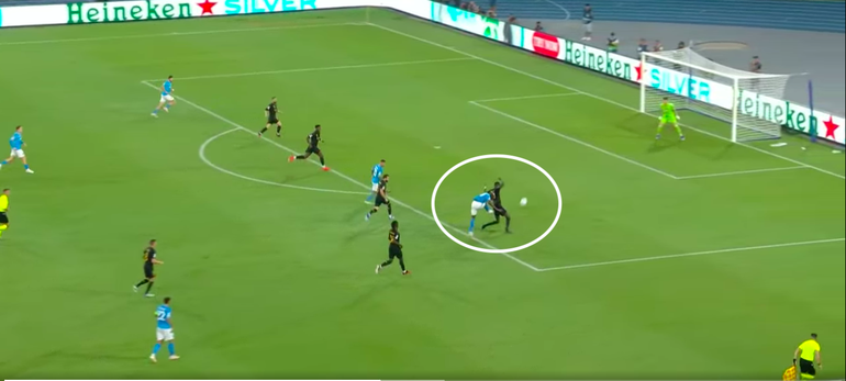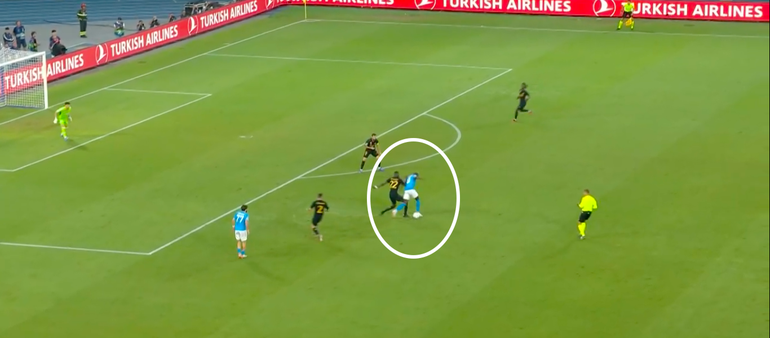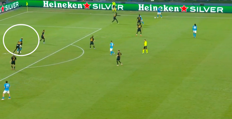 Real’s approach partly worked. Napoli’s centre-forward won two of 10 aerial duels and was unsuccessful in four of his six ground duels. Many were against the Los Blancos defender.