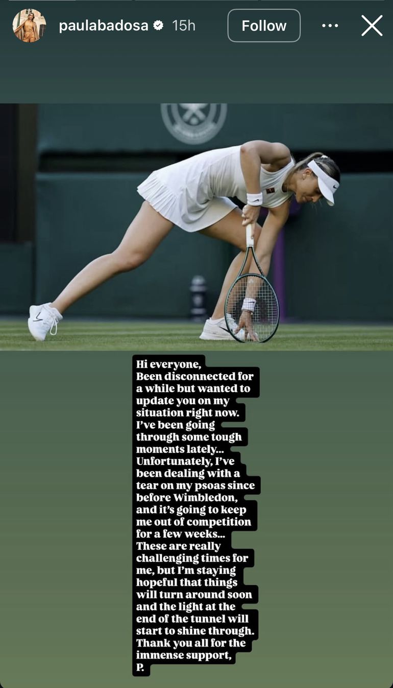 Two weeks after her first-round exit at Wimbledon, Paula Badosa (27, WTA No. 10) provided an update on her condition, announcing she will be sidelined for several weeks due to a medical issue.