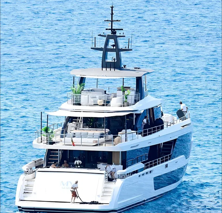 The images, obtained by the Daily Mail, show the 40-year-old star looking relaxed in white swim shorts, laughing with Georgina and soaking in the Mediterranean sun from the deck of his lavish vessel, the 88-feet long Azimut Grande.