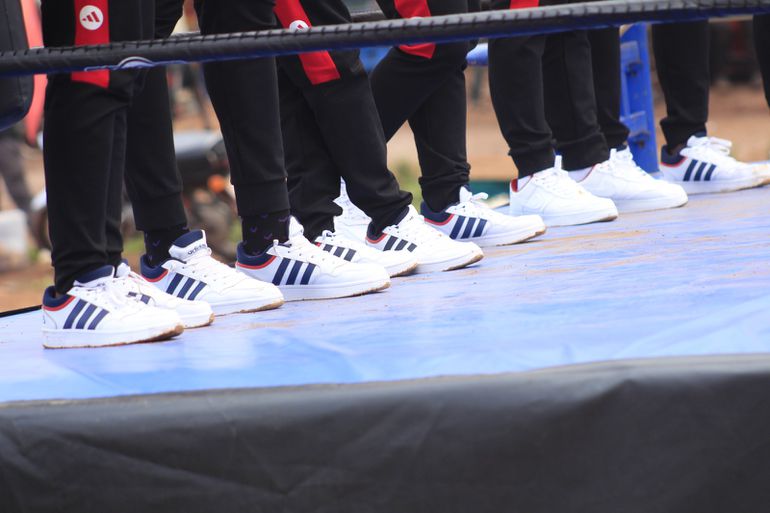 The Bombers rocking similar adidas and Nike footwear during their celebrations in Kawaala after their Africa Boxing Championships exploits