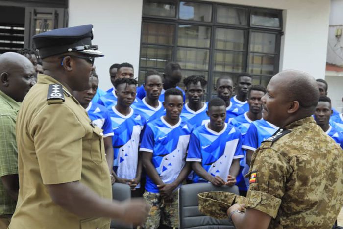 AIGP Tom Magambo (L) meeting Police FC players (in the background). PHOTO: Twitter/UPF
