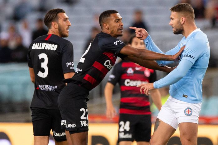 Rashid Mahazi (22) unhappy with each other at round 23 of the Hyundai A-League Soccer between Western Sydney Wanderers FC and Melbourne City FC on March 30, 2019 at ANZ Stadium in Sydney, Australia.
