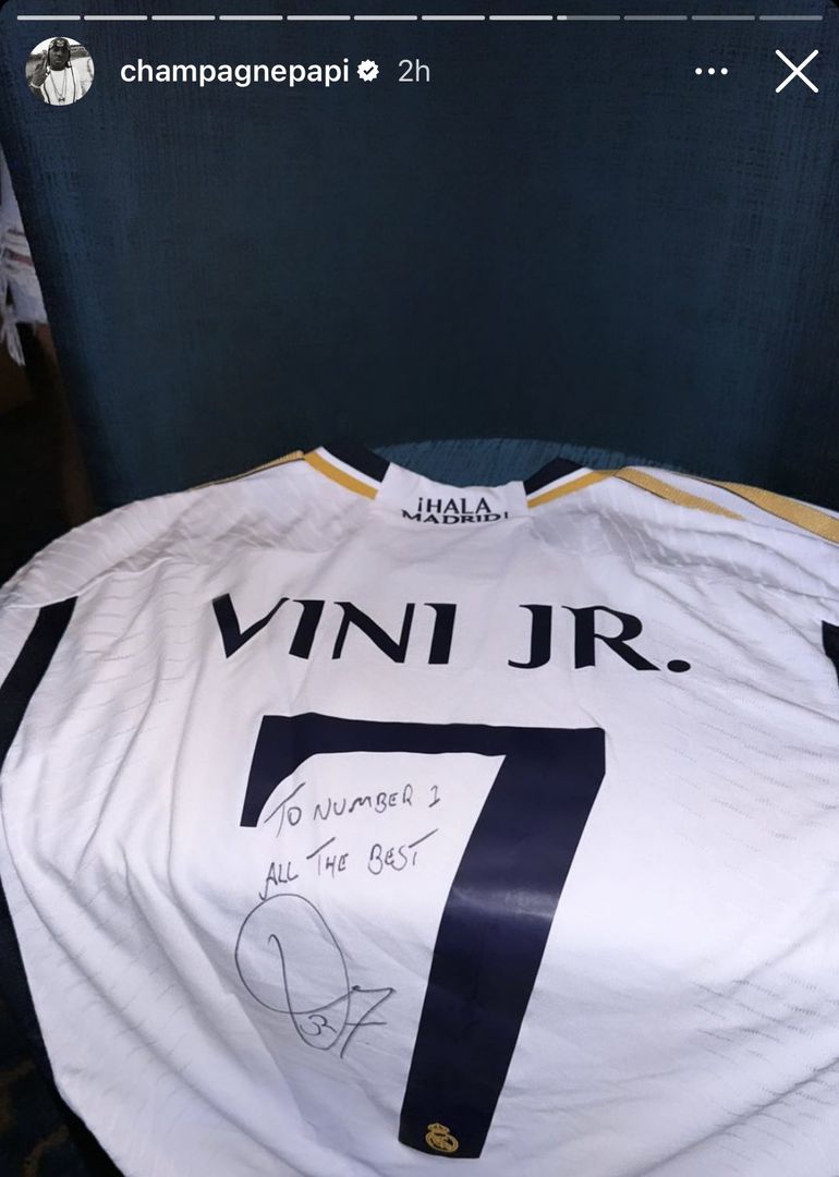 On Instagram, Canadian musician Drake displayed a Vinicius 2023/24 Real Madrid home jersey.