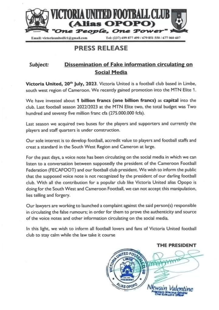 Valentine Nkwain, president of Victoria United said, as reported by Footcam, “For the past few days, a voice note has been circulating on social media in which we can hear a supposed conversation between the President of the Cameroon Football Federation (FECAFOOT) and the president of our football club.