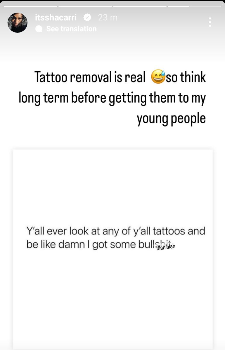 In her response, Richardson said: "Tattoo removal is real, so think long term before getting them to my young people."