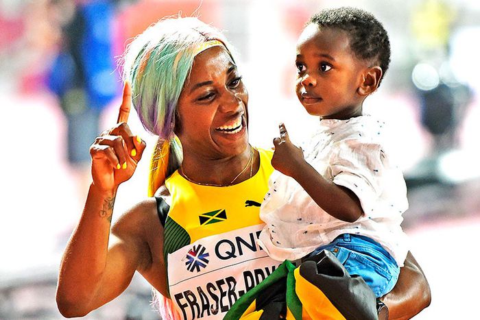 Shelly-Ann Fraser-Pryce and her son Zyon after winning the world title in 2019