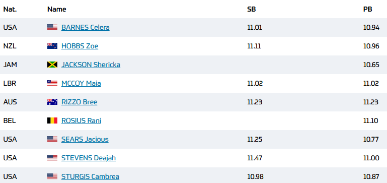 Also in the formidable field with a fast SB of 11.01s is Celera Barnes, Liberia's Maia Mccoy at 11.02s, New Zealand's Zoe Hobbs at 11.11s, and indoor standout Jacious Sears.