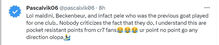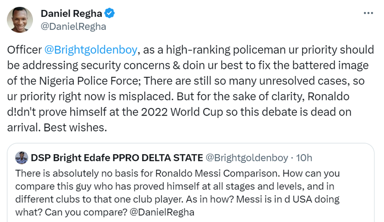 As expected, fans of the Argentine were in disagreement with the cop, as they believe the absence of a World Cup in Ronaldo’s trophy cabinet makes Edafe's statement untenable.