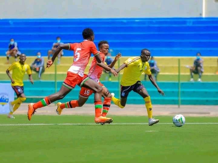 Striker Oscar Mawa (R) taking on Kenyan defenders during CECAFA U17 championships in Kigali, Rwanda a few years ago. FUFA Image