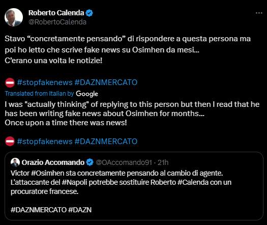 Calenda responded to the tweet about Osimhen possibly seeking new representation, saying, “I was ‘seriously thinking’ of replying to this person but then I read that he has been writing fake news about Osimhen for months… Once upon a time there was news!”