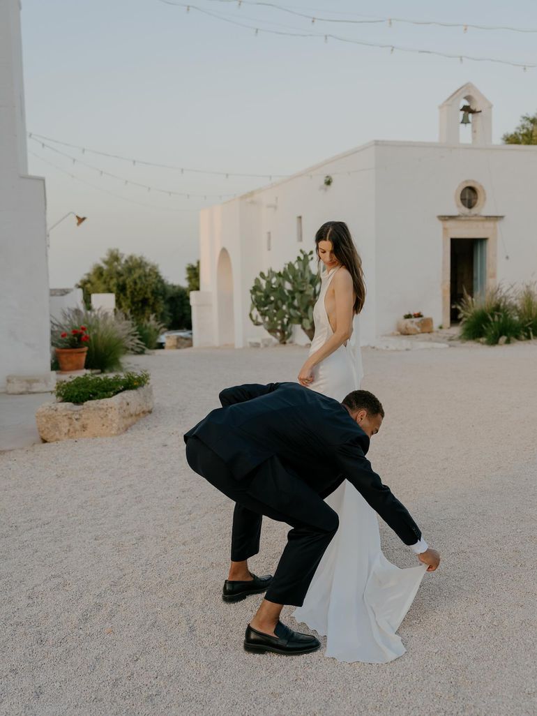 Another striking shot shows Dessers adjusting Rosalie’s wedding gown outside a charming white chapel.