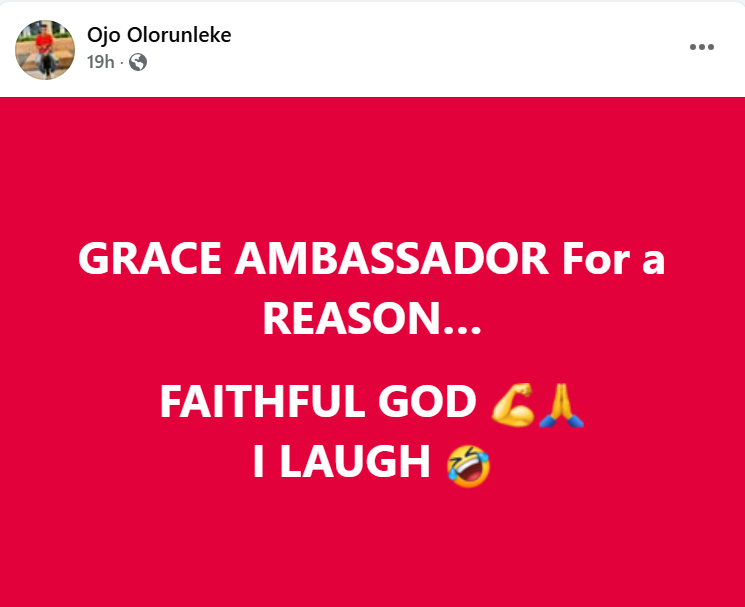 He emphasised his faith in a brighter future with another post stating, “GRACE AMBASSADOR For a REASON… FAITHFUL GOD 💪🙏 I LAUGH,” reflecting his positive mindset amid adversity.