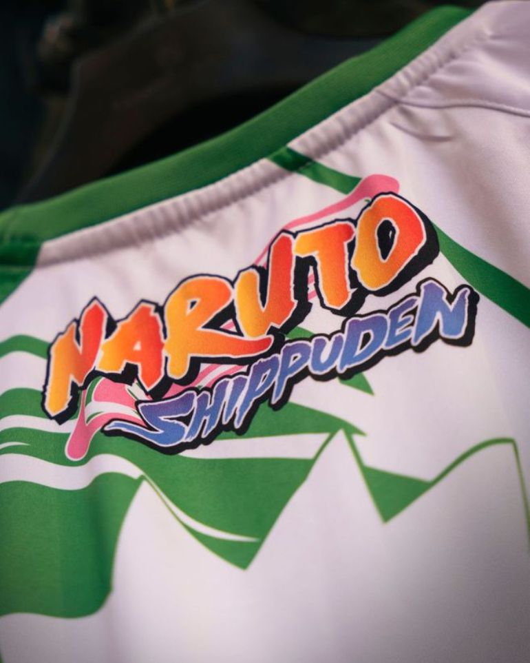 The jersey features Naruto Uzumaki prominently on both the front and back, with his emblem on the sleeve and the Naruto Shippuden logo on the upper back.