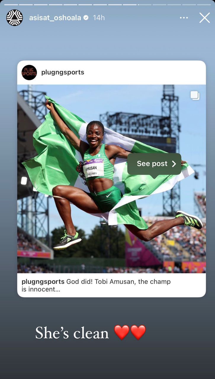 The five-time African Women’s Footballer of the Year while referring to World Champion Tobi Amusan said, " She's clean."