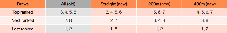 The new format will see a similar draw for the top ranked athletes taking lanes 3,4,5 and 6. The next ranked will draw either lane 2 or 7, with the last ranked drawing lane 1 and 8.