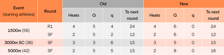 The primary concern has been the apparent disadvantage athletes in the first heats face compared to those in subsequent heats. In response to this, the Championships will now base qualifications for the 1500m, 3000m steeplechase, and 5000m on positions rather than time.