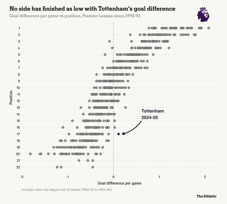 Tottenham’s goal difference this season isn’t just an anomaly — it’s a Premier League first. No side has ever finished this low with a goal tally in the black.