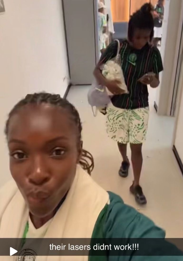 But in her post-match celebrations, Michelle Alozie took to her Snapchat to mock the Moroccan supporters’ efforts, posting a lively video of herself and Okoronkwo celebrating their victory with the cheeky caption: “Their lasers didn’t work.”