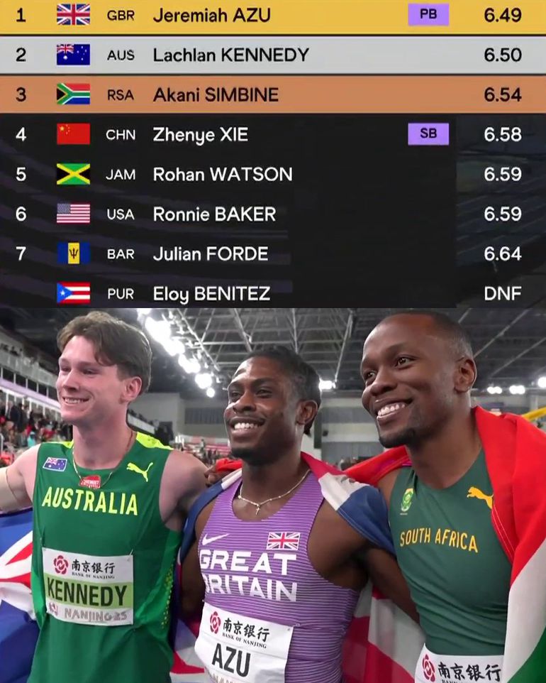 South Africa's sprint legend Akaini Simbine finally has an individual medal to call his own after blazing to the 60m bronze medal in a thrilling contest to end day one of the World Indoor Championships in Nanjing.