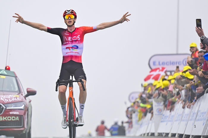Battling deep fog, fatigue, and fearsome gradients, the Ineos-Grenadiers rider crossed the finish line at the summit of Superbagnères visibly drained, collapsing to the ground with his head in his hands after a sensational ride.