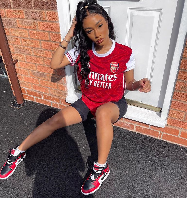 The beautiful influencer has sported the Gunners’ jersey in some of the pictures posted on her social media page.